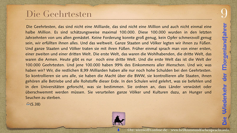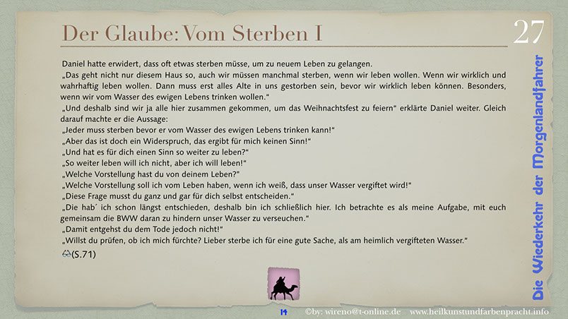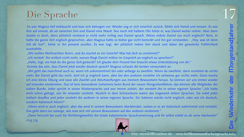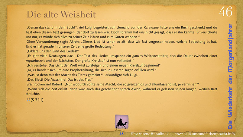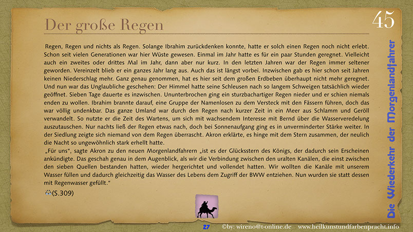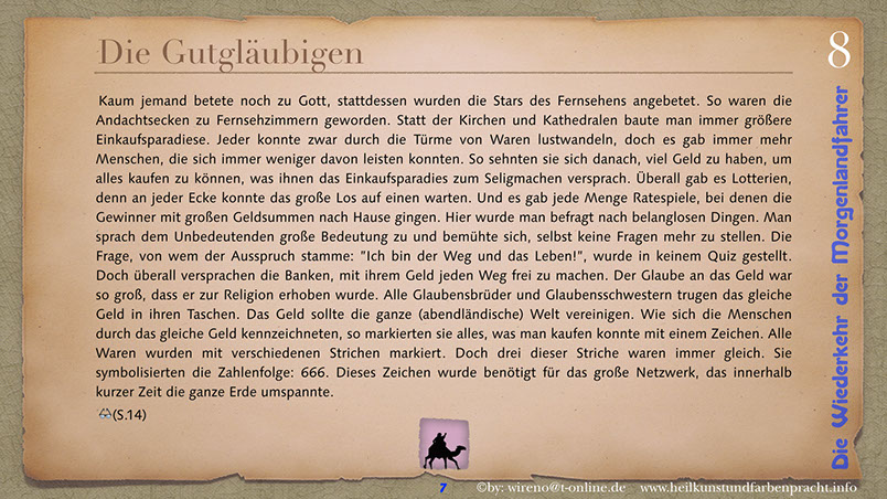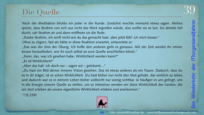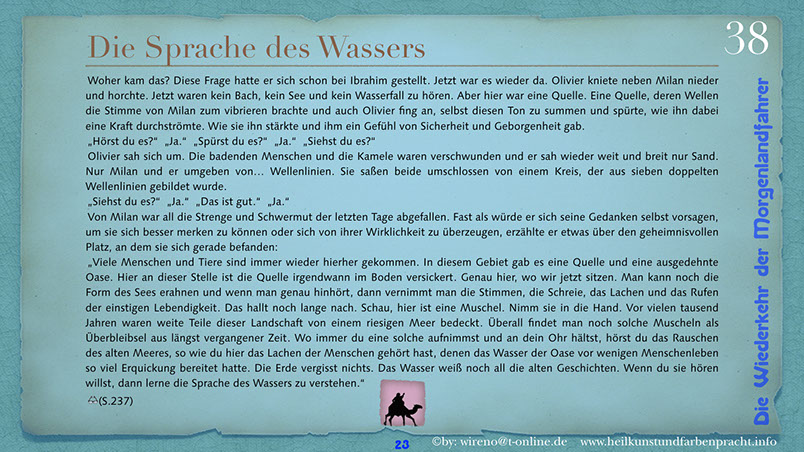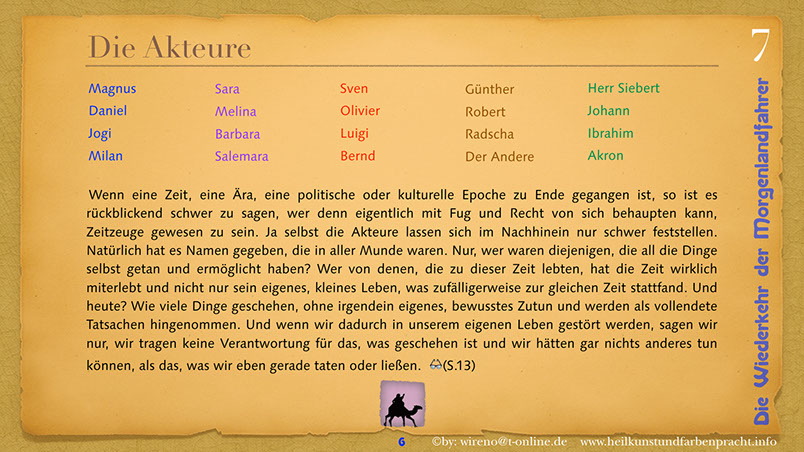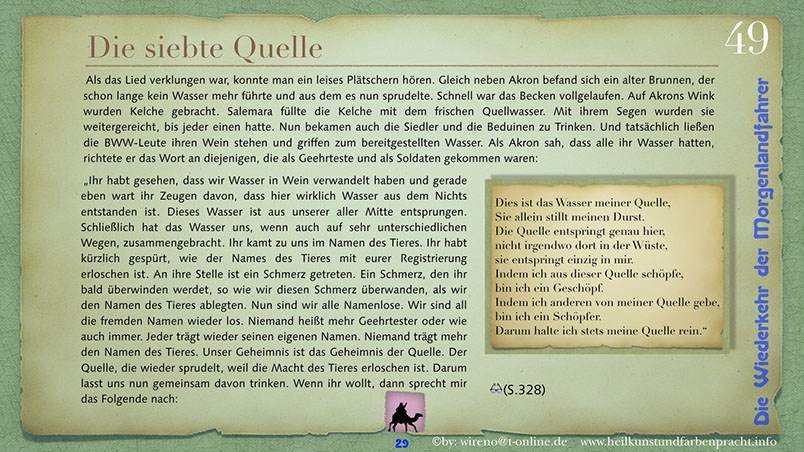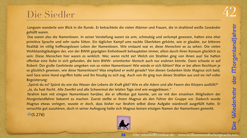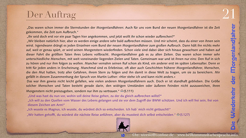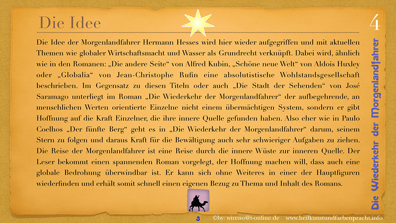 Die Idee der Morgenlandfahrer Hermann Hesses wird hier wieder aufgegriffen und mit hochaktuellen Themen verknüpft: Auf der einen Seite steht eine gigantische, den Globus beherrschende Wirtschaftsmacht und ihr gegenüber befindet sich die entmachtete Gruppe der Vielen. Ein paar Wenige wagen es, um ihr Grundrecht auf sauberes Wasser zu kämpfen und bringen das Machtgefüge der Weltmacht an seine Grenzen. Der Roman gibt Hoffnung auf die Kraft der Einzelnen, die ihre innere Quelle gefunden haben. Hier geht es darum, dem inneren Stern zu folgen und daraus Kraft für die Bewältigung auch sehr schwieriger Aufgaben zu ziehen. Die Reise der Morgenlandfahrer ist eine Reise durch die innere Wüste der eigenen Seele. Es ist eine Reise zur inneren Quelle. Sieben Künste weisen den Weg dorthin. Jeder findet seinen eigenen Weg. Der Leser bekommt einen spannenden Roman vorgelegt, der Hoffnung machen will, dass auch eine globale Bedrohung überwindbar ist. Er kann sich ohne Weiteres in einer der Hauptfiguren wiederfinden und erhält somit schnell einen eigenen Bezug zu Thema und Inhalt des Romans. Und er kann sich auf seinen eigenen Weg, zu seiner eigenen Quelle begeben! Und hier einige Textauszüge: