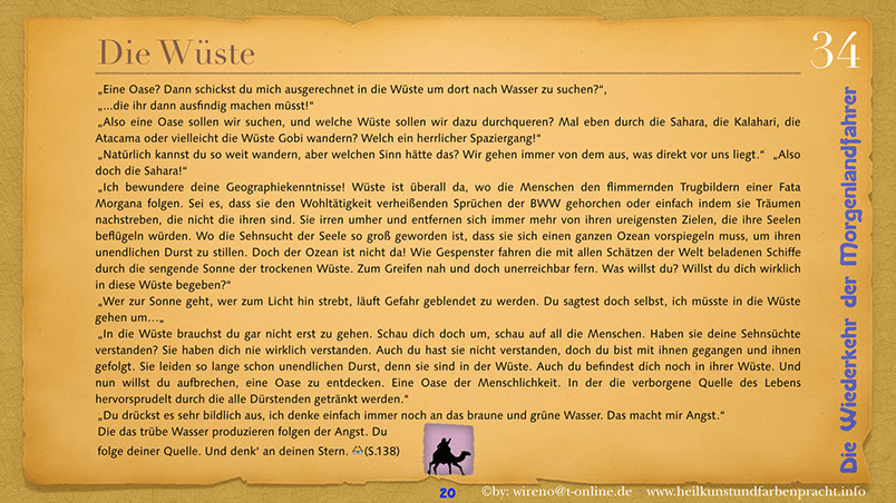„In die Wüste brauchst du gar nicht erst zu gehen. Schau dich doch um, schau auf all die Menschen. Haben sie deine Sehnsüchte verstanden? Sie haben dich nie wirklich verstanden. Auch du hast sie nicht verstanden, doch du bist mit ihnen gegangen und ihnen gefolgt. Sie leiden so lange schon unendlichen Durst, denn sie sind in der Wüste. Auch du befindest dich noch in ihrer Wüste.